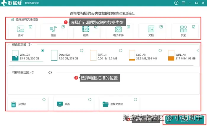 第1步: 打开数据 蛙恢复专家软件,然后再首页上选择需要恢复的数据类型和扫描位置,最后启动软件扫描功能;