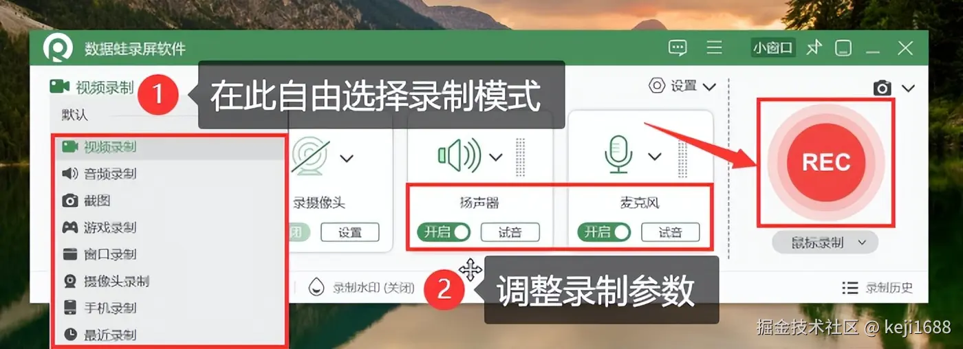 步骤1:在电脑上启动软件,选择合适的录制模式和调整录制参数后,点击 【REC】 进行录屏。