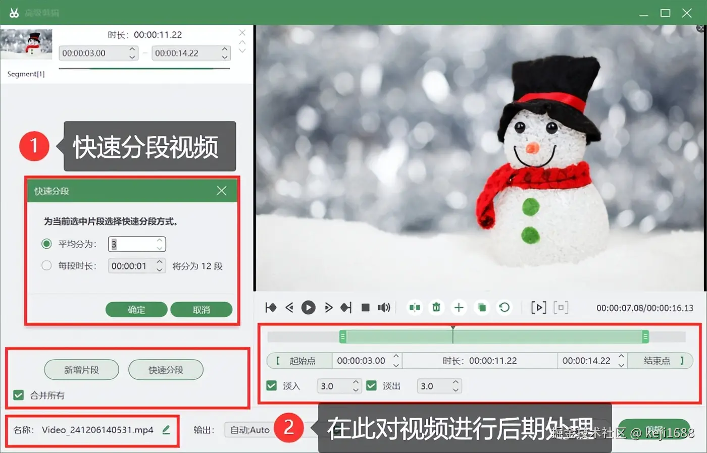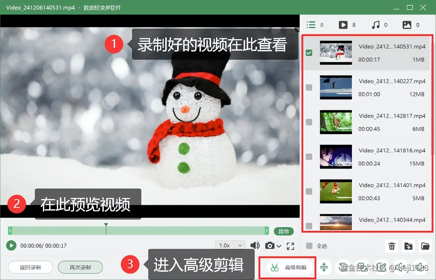 步骤3:如果需要对视频进行后期编辑处理,直接点击 【高级剪辑】 按钮进入即可对视频进行分段、剪辑、增加特效等操作。