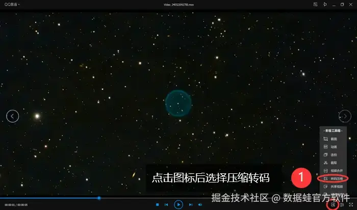 步骤二: 在视频播放界面,点击右下角的 【影音工具箱】 ,选择 【压缩转码】 功能。