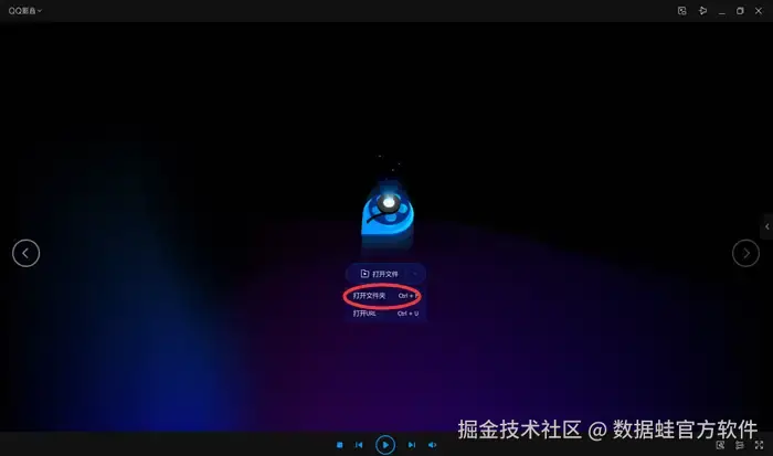 步骤一: 打开QQ影音软件,点击界面中间的 【打开文件】 按钮,选择 【打开文件夹】 ,点击需要转换的视频文件。
