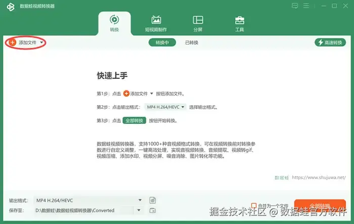 步骤一: 启动数据 蛙视频转换器,在界面中点击 【+添加文件】 ,在文件列表中选择需要转换的视频文件。