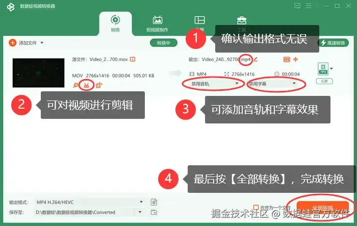 步骤三: 确认文件格式转换无误后,数据蛙视频转换器还提供了丰富的编辑功能。您可以根据个人喜好为视频添加字幕、音轨,甚至进行文件压缩。当所有参数调整完毕后,点击 【全部转换】 按钮,开始转换工作,完成文件的转换。
