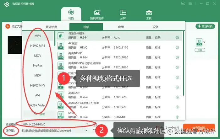 步骤二: 点击软件左下角的 【输出格式】 选项后,在弹出的选项栏中,请确认选择您需要的输出格式(本文以mp4格式为例)。在下方的栏位中,选择保存文件的路径。为了避免系统盘(C盘)的内存被占用,建议您选择其他盘符(如D盘或E盘)进行文件的保存,以确保系统运行的流畅性。