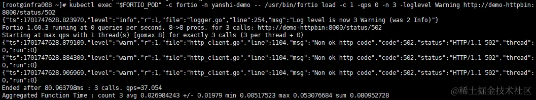 【kubectl exec "$FORTIO_POD" -c fortio -n yanshi-demo -- /usr/bin/fortio load -c 1 -qps 0 -n 3 -loglevel Warning http://demo-httpbin:8000/status/502】
