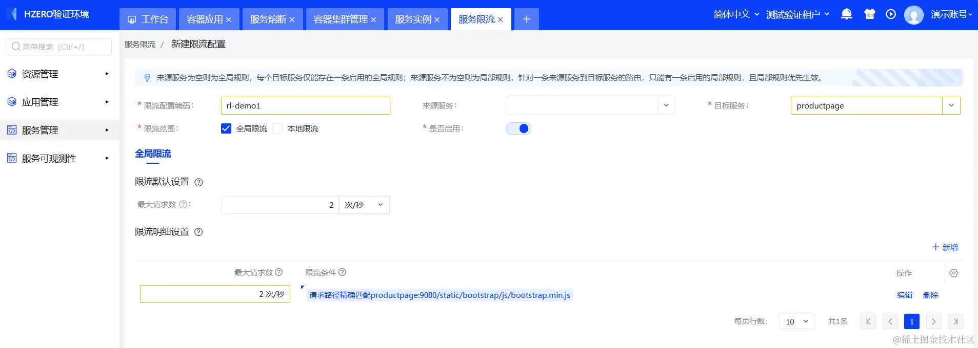 选择目标服务productpage,如下配置表示当请求路径精确匹配并且请求数大于2时,就会触发限流。