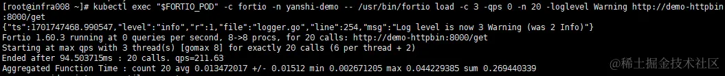 【kubectl exec "$FORTIO_POD" -c fortio -n yanshi-demo -- /usr/bin/fortio load -c 3 -qps 0 -n 20 -loglevel Warning http://demo-httpbin:8000/get】