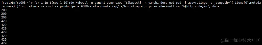 【for i in (kubectl -n yanshi-demo get pod -l app=ratings -o jsonpath='{.items[0].metadata.name}')" -c ratings -- curl -s productpage:9080/productpage -o /dev/null -w "%{http_code}\n"; done】
