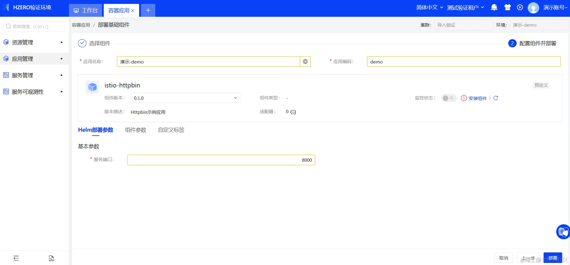 部署基础组件选择istio-httpbin组件进行部署,各字段填写如下图所示: