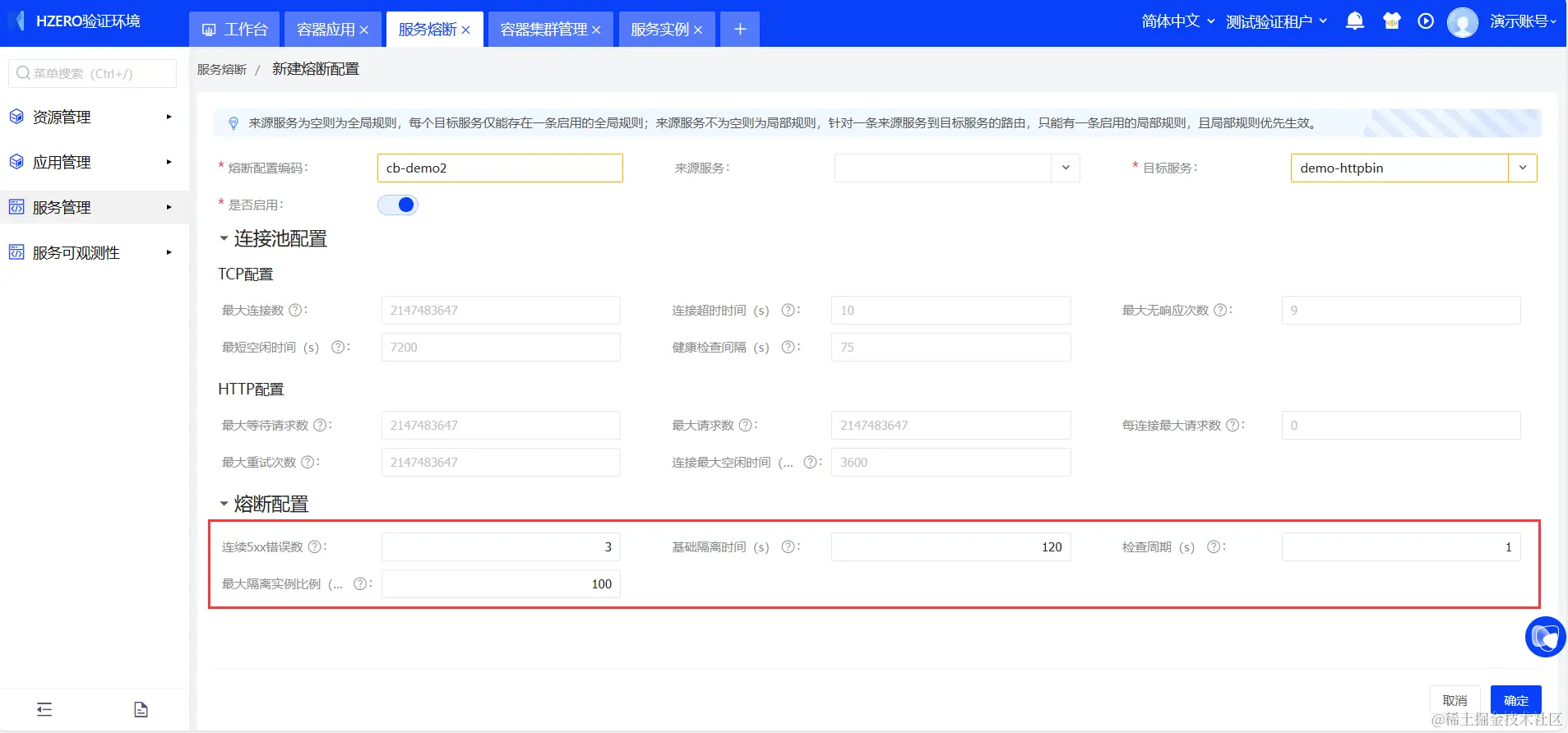 选择目标服务demo-httpbin,如下配置表示当连续出现5xx错误数为3时,就会触发熔断。
