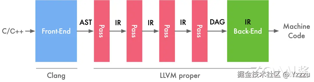 编译的不同阶段会产生不同的数据结构和中间表达,如前端的抽象语法树(AST)、优化层的 DAG 图、后端的机器码等。后端优化时 DAG 图可能又转为普通的 IR 进行优化,最后再生产机器码。