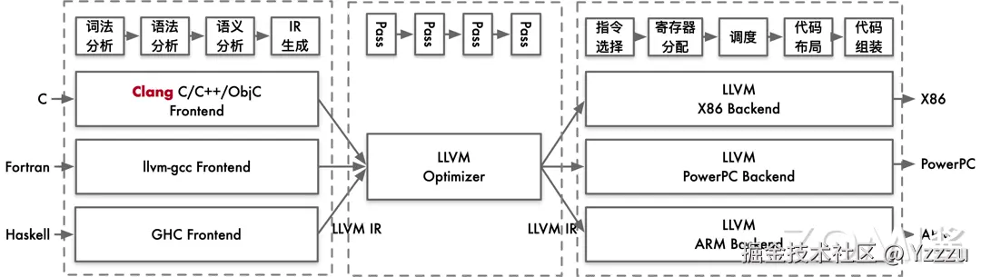 后端:将优化后的中间表示 IR 转换成目标机器的特定语言,确保代码能够在特定硬件上高效运行。