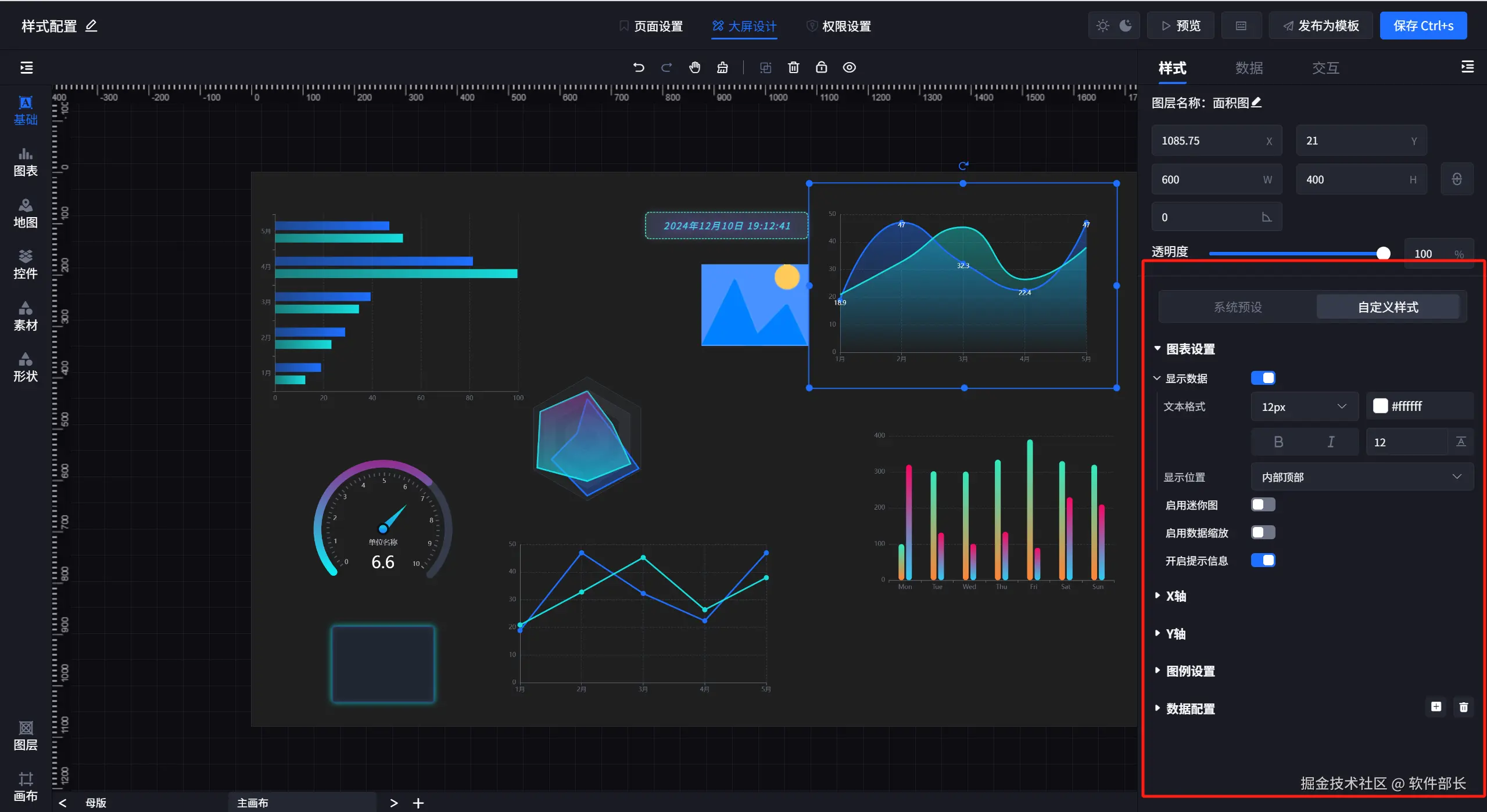 3、大屏图表组件—折线图组件,将样式进一步优化。可设置折线图的更多样式细节,如渐变主题色、透明度、图例布局方式水平或垂直、字体颜色、折线图样式是面积堆叠图还是折线图等。