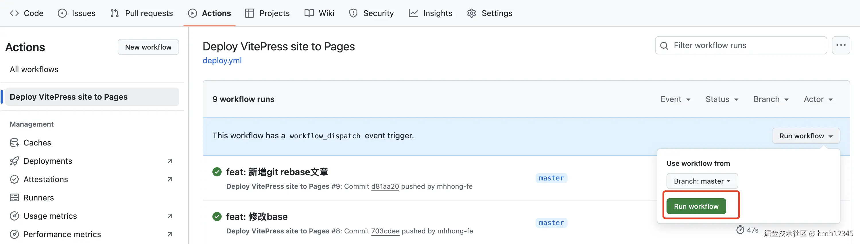代码push到master之后,就会自动触发workflow,开始构建、部署