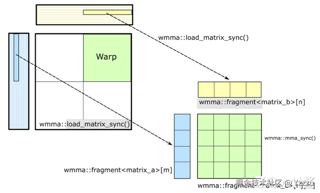 Tensor Core 是英伟达 GPU 的硬件,CUDA 编程模型提供了 WMMA(Warp-level Matrix Multiply-Accumulate)API,这个 API 是专门为 Tensor Core 设计的,它允许开发者在 CUDA 程序中直接利用 Tensor Core 的硬件加速能力。通过 WMMA API,开发者可以执行矩阵乘法累积操作,并管理数据的加载、存储和同步。