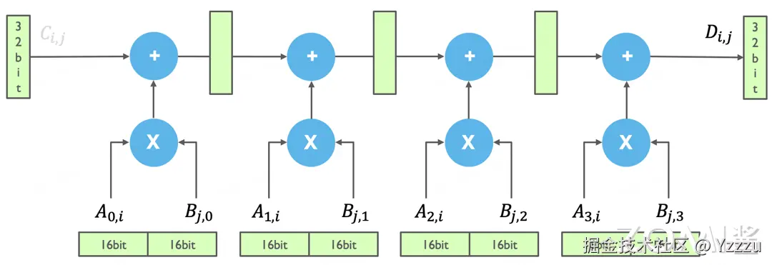 在 Tensor Core 实际计算的时候,实现输出一个元素的计算,即用 A 的一行乘以 B 的一列,就要有四条 Pipeline 的流水线。