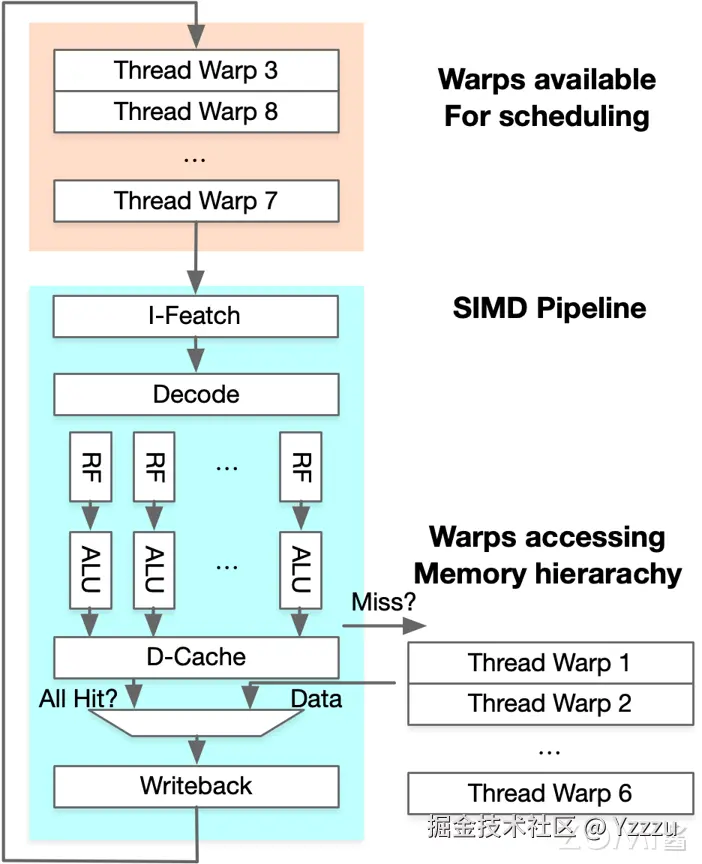 SIMT 架构通过细粒度多线程(FGMT)隐藏延迟,SIMD Pipeline 中每个线程一次执行一条指令,Warp 支持乱序执行以隐藏访存延迟,并不是通过顺序的方式调度执行,此外线程寄存器值都保留在 RF(Register File)中,并且 FGMT 允许长延迟。英伟达通过添加 Warp Schedluer 硬件调度,使 Warp 先访存完毕之后交给 SIMD Pipeline 去执行尽可能多的指令,隐藏其它 Warp 的访存时间。