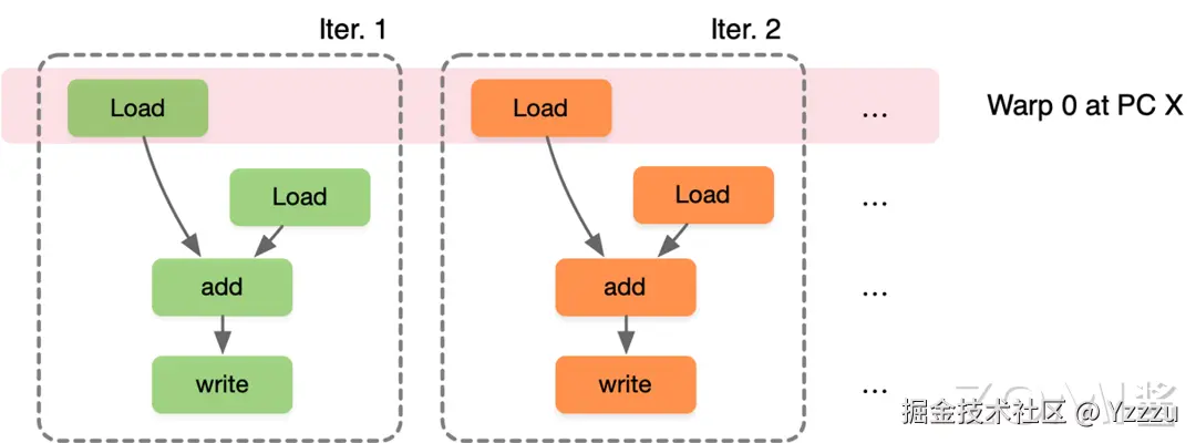 SIMT 架构 GPU 通过细粒度的多线程(Fine-Grained Multi-Threading,FGMT)调度,将处理器的执行流水线细分为更小的单元,使得不同线程的指令可以交错执行,从而减少指令执行的等待时间和资源浪费,以此来实现访存和计算并行。