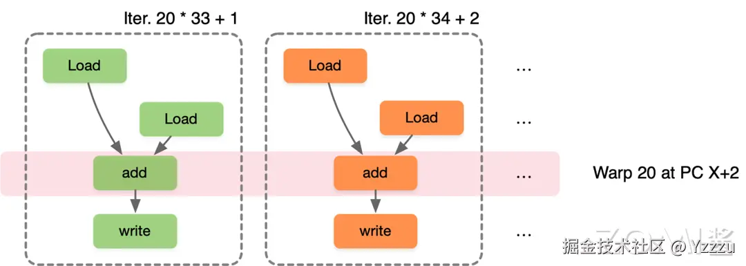 以此类推,第二十一个迭代 Warp20 执行第 20x33+1 ~ 20x33+32 个线程:
