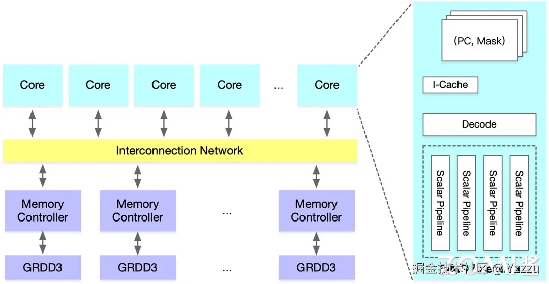 在 GPU 宏观架构层面,GDDR 里面的数据通过内存控制器(Memory Controller)传输到片内总线(Interconnection Network),然后分发到具体的核心(Cuda Core/Tensor Core),在每个执行核心中会有 SIMD 执行单元,从而实现并行计算。