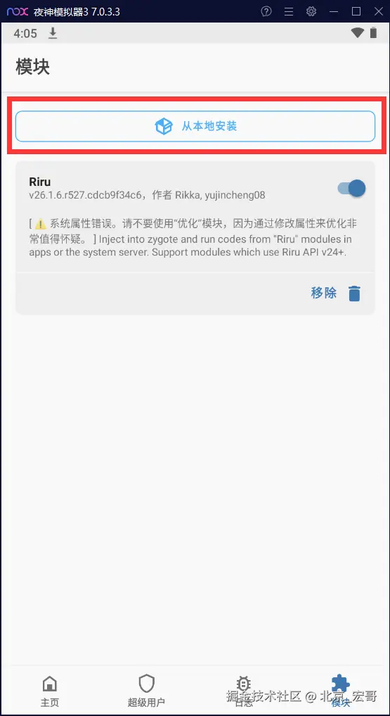 4.启动magisk后,点击“模块”,然后点击“本地安装”,如下图所示: