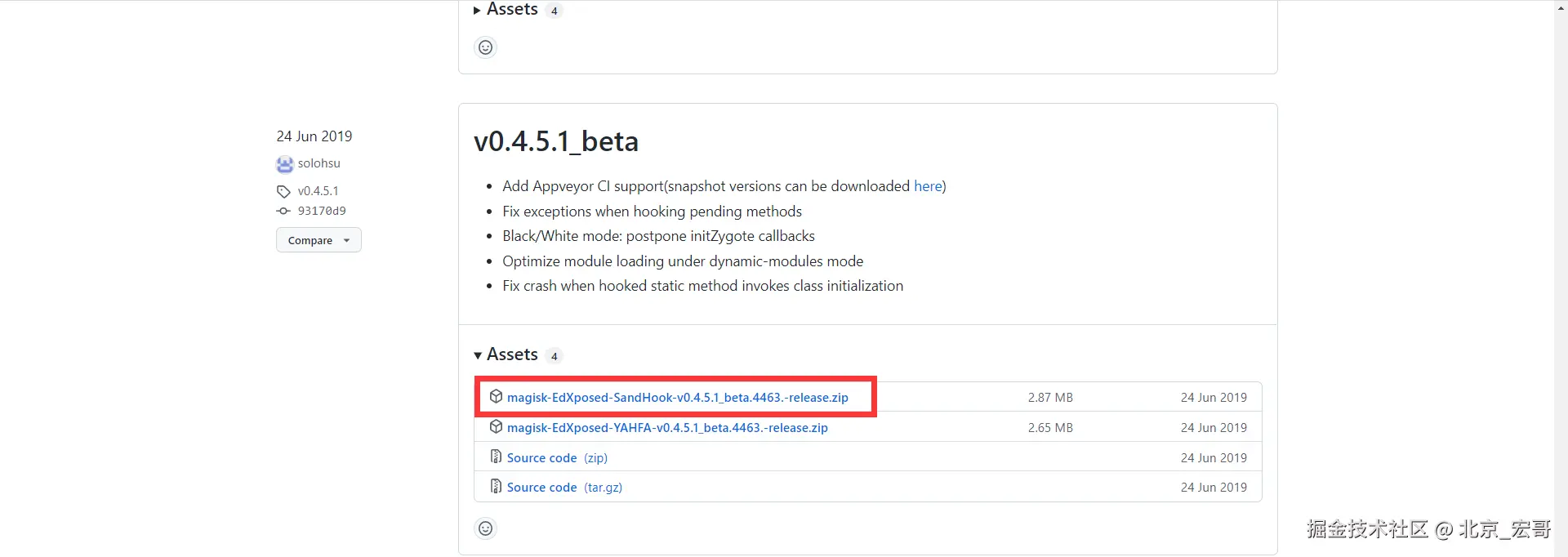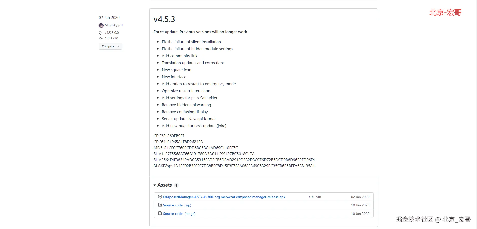所以我们直接安装EdXposed Manager。有许多版本,我们下载哪一个呢?我们下载的EdXposed是0.4.5.1 这个发行日期为2019-06-24我们找一个最接这个时间的EdXposed管理器版本即可这里我选择了4.5.3版本。如下图所示: