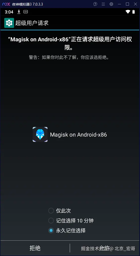 A.在终端 输入命令 inmagisk 后 回车,再输入命令 y ,回车,之后会弹出 请求 root权限 的窗口,勾选 永久记住选择 那个选项 并 点击 允许。如下图所示: