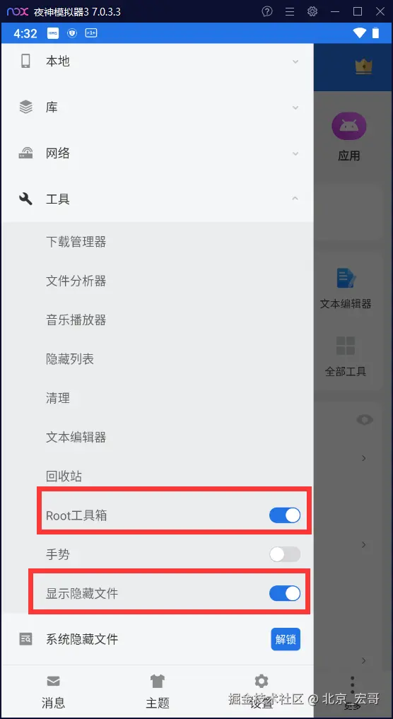 1.下载安装ES浏览器,自己百度下载一个,宏哥这里就不说下载地址了。然后启动软件开启“Root工具箱”和“显示隐藏文件”,如下图所示: