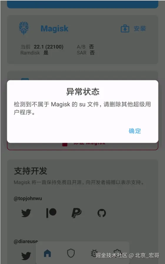 我们在刷入面具magisk后可能会遇见一种异常状态,如下图所示: