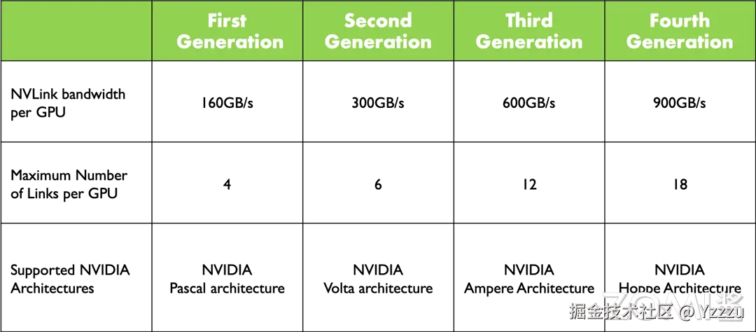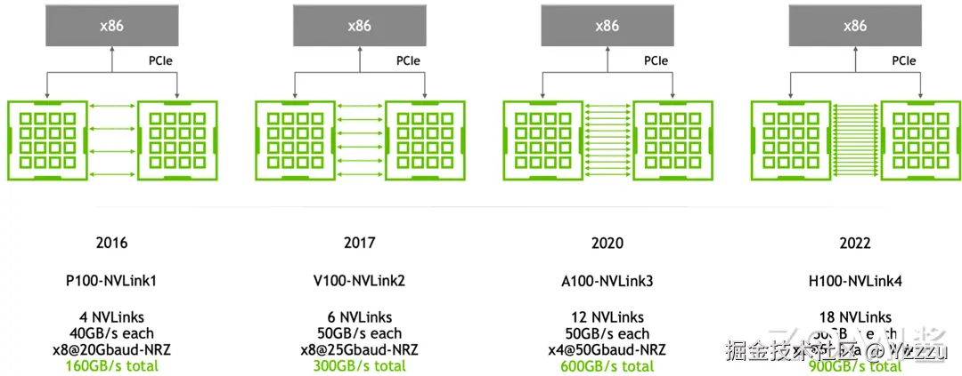此外,由于单个 GPU 工作线程的内存有限,并且许多大模型的大小已经超出了单个 GPU 的范围。所以就需要实现跨多个 GPU 的模型训练,这种训练方式就涉及到了分布式通信和 NVLink。当谈及分布式通信和 NVLink 时,我们进入了一个引人入胜且不断演进的技术领域,本节我们将简单介绍分布式通信的原理和实现高效分布式通信背后的技术 NVLink 的演进。
