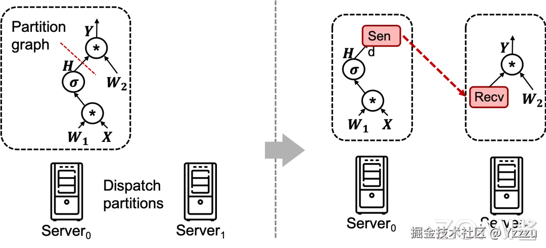 如上图所示,在 AI 计算框架中,我们需要将原来的一个网络模型进行切分,将其分布在不同的机器上进行计算,这里通过在模型中插入 Send 和 Recv 节点来进行通信。