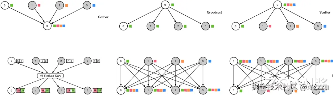 例如,一对多的广播(broadcast)、多对一的收集(gather)、多对多的收集(all-gather)、一对多的发散(scatter)、多对一的规约(reduce)、多对多的规约(all-reduce)、组合的规约与发散(reduce-scatter)、多对多的全互连(all-to-all)等。下面我们简单介绍几个。