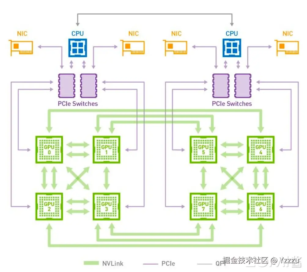 通过 CPU 的调度:在没有直接 GPU 对 GPU 通信能力的系统中,CPU 充当数据交换的中介。CPU 负责在多个 GPU 之间分配和调度计算任务,以及管理数据在 GPU 和系统内存之间的传输。
