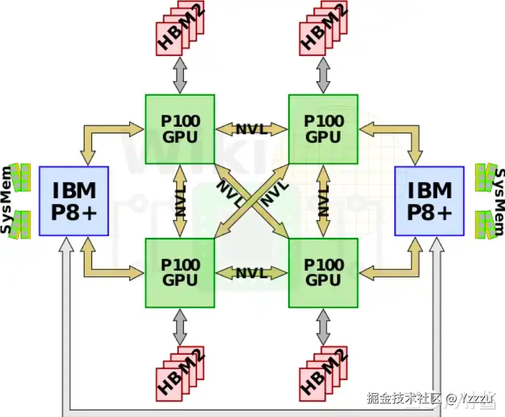 初代 DGX-1 通常采用了一种类似于上图的互联形式。不过,IBM 在基于 Power8+微架构的 Power 处理器上引入了 NVLink 1.0 技术,这使得英伟达的 P100 GPU 可以直接通过 NVLink 与 CPU 相连,而无需经过 PCIe 总线。这一举措实现了 GPU 与 CPU 之间的高速、低延迟的直接通信,为深度学习和高性能计算提供了更强大的性能和效率。