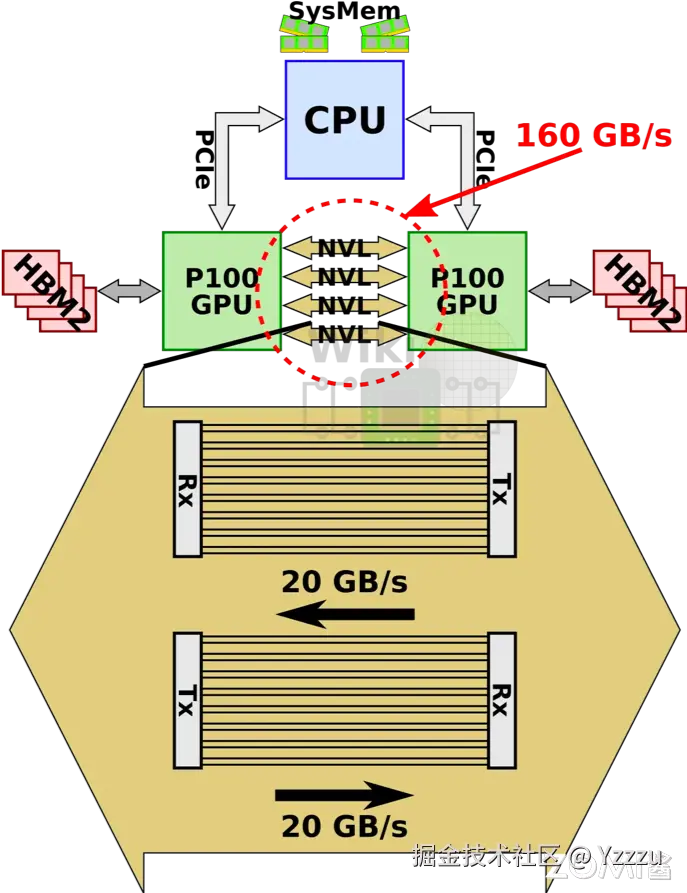 为了克服传统 PCIe 通信带宽的限制,英伟达开创性地推出了一种名为 NVLink 的高速互连架构。这项技术首次亮相于 P100 GPU 中,标志着高性能计算通信技术的一大飞跃。NVLink 的设计初衷是为了超越传统的 PCIe 通道,实现 GPU 间以及 GPU 与 CPU 之间更高效率、更高带宽的数据传输。