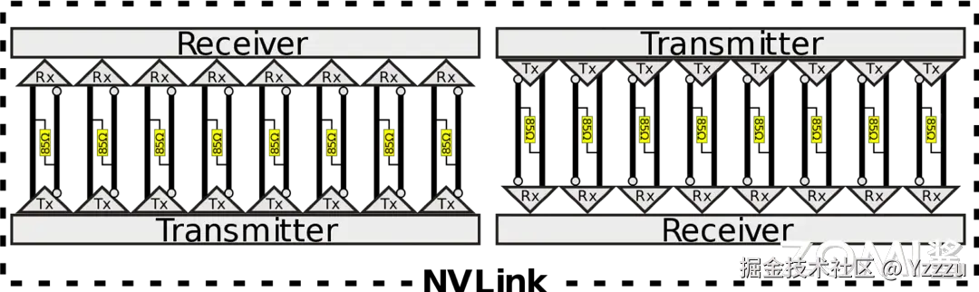 在 NVLink 的链接架构中,一个关键的概念是“Brick”,它指的是 NVLink 通道的基本单元。如上图所示,每个 NVLink 是一个双向接口,由 8 个差分对组成,总计 32 条线。这些差分对采用直流耦合(DC coupled)技术,并配置有 85 欧姆的差分终端,以优化信号传输质量。