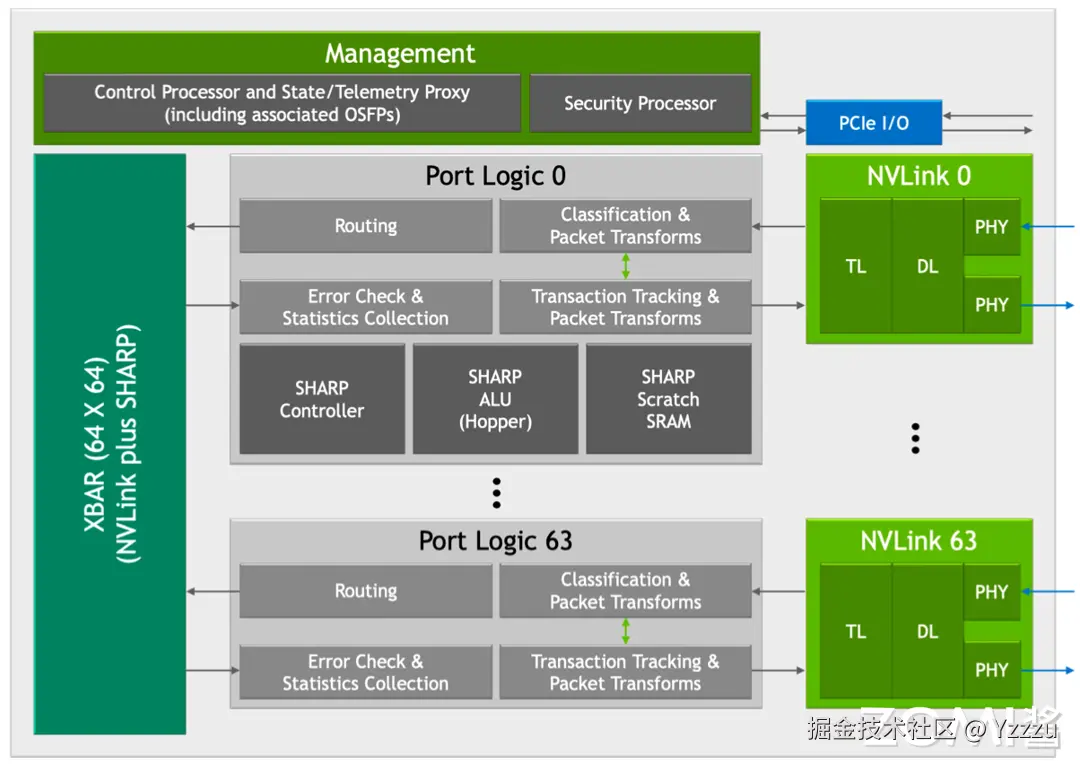 NVSwitch 中的交叉开关(XBAR),经过精心调整和优化,与 SHARP 模块的数据传输需求完美匹配。这一协同设计,确保了数据在 GPU 间传输时的高效率和低延迟,提升系统的整体性能。