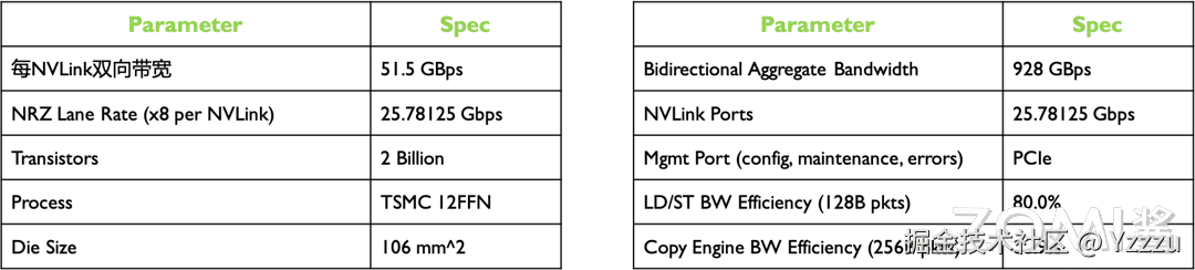 其次,NVSwitch 基于台积电的 12nm FinFET FFN 工艺制造,这种先进的工艺技术使得 NVSwitch 能够在 100W 的功率下运行,同时集成了高达 2 亿个晶体管。