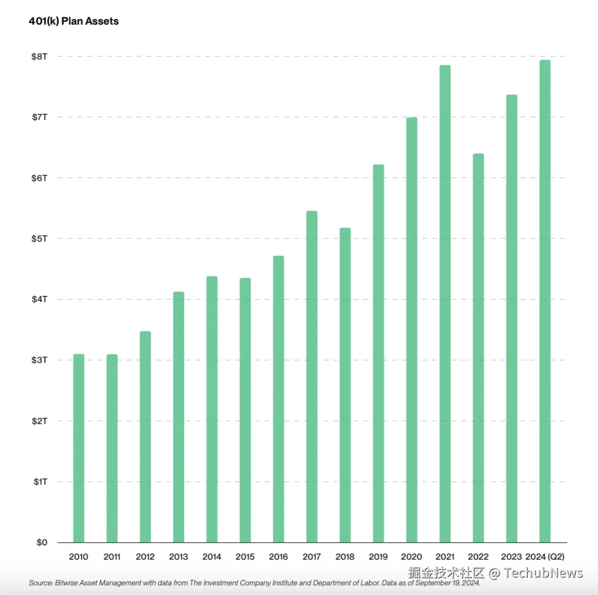 美国的 401(k)计划持有 8 万亿美元的资产。每周都有更多的资金流入这些基金。如果加密货币占据了 401(k) 资产的 1%,那么就有 800 亿美元的新资本会进入这一领域,并在此后源源不断地流入。而如果份额达到 3%,那就是 2400 亿美元!