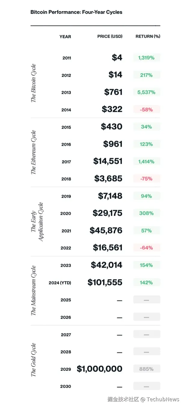 至于为什么是 2029 年?从历史上看,比特币是以四年为周期波动的。虽然不能保证这种情况会持续下去,但 2029 年将标志着下一个周期的顶点(同时也是比特币诞生 20 周年)。在比特币诞生后的 20 年内超越黄金将是一个相当大的成就,但我们认为比特币可以做到。(注:如果美国宣布购买 100 万枚比特币作为战略储备,那么我们可以更快地达到每比特币 100 万美元的目标)。