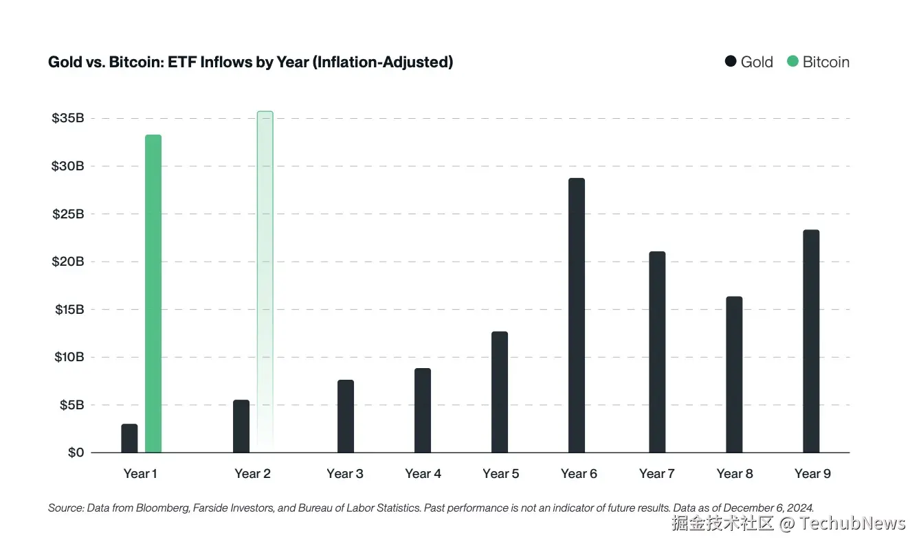 - 第一年通常是 ETF 发展最缓慢的一年: 对于比特币 ETF 的推出,我们有一个最好的历史类比,那就是 2004 年黄金 ETF 的推出。当年,黄金 ETF 一上市就获得了 26 亿美元的资金流入,令所有人都兴奋不已。但看看随后几年的情况:第 2 年 55 亿美元,第 3 年 76 亿美元,第 4 年 87 亿美元,第 5 年 168 亿美元,第 6 年 289 亿美元(根据通胀调整后的数字)。重点是,第 2 年的资金流量超过第 1 年,流量逐渐减少是不正常的。