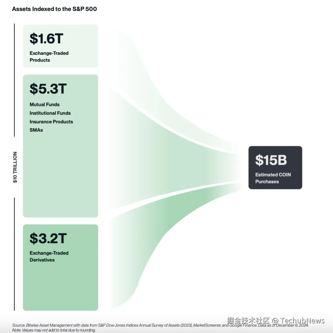 考虑一下:有 10 万亿美元的资产直接追踪标普 500 指数,另有 6 万亿美元的资产以该指数为「基准」。如果 Coinbase 加入该指数,我们预计基金将购买约 150 亿美元的 Coinbase 股票。而如果以该指数为基准的基金也囊括 Coinbase,股票购买量将再增加 90 亿美元。