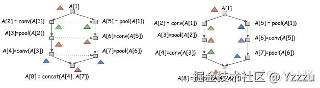 从总体的角度看,上文中提到的两种内存优化方法 Inplace Operation 和 Memory Sharing,如果要较为复杂的模型,如下图中右侧图所示计算图,进行内存优化的操作复杂度较高,为此研究者提出了一些新的内存优化算法。