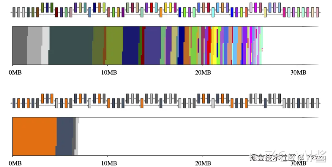 最终可以看到在上图左下角为最终内存分配的方案,需要注意的是此处为预执行的操作而非模型真实运行中进行的内存分配,不同的颜色代表不同的内存分配的空间。