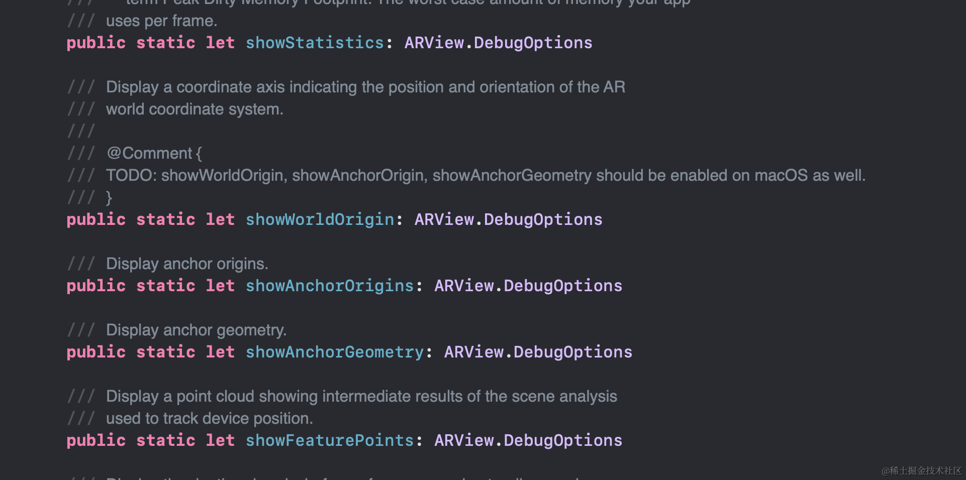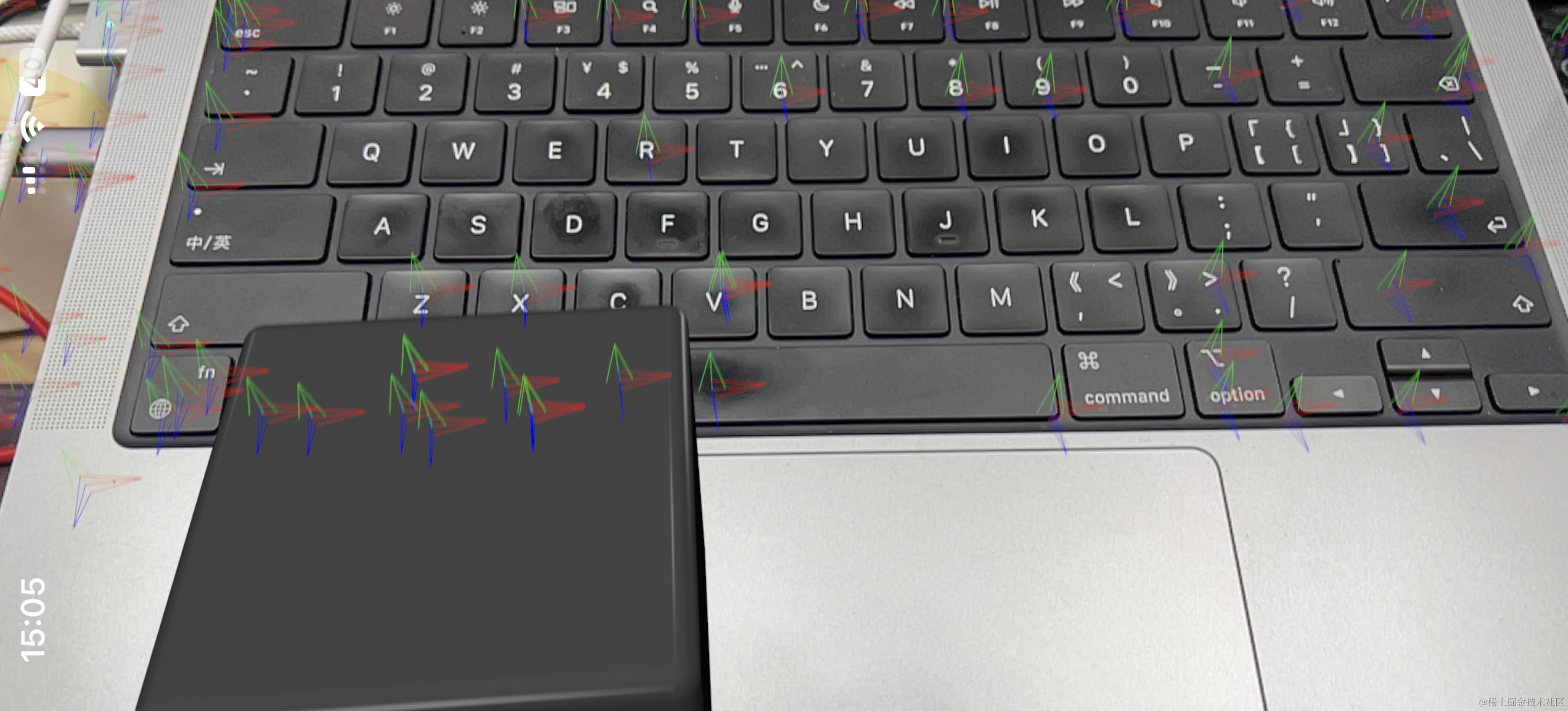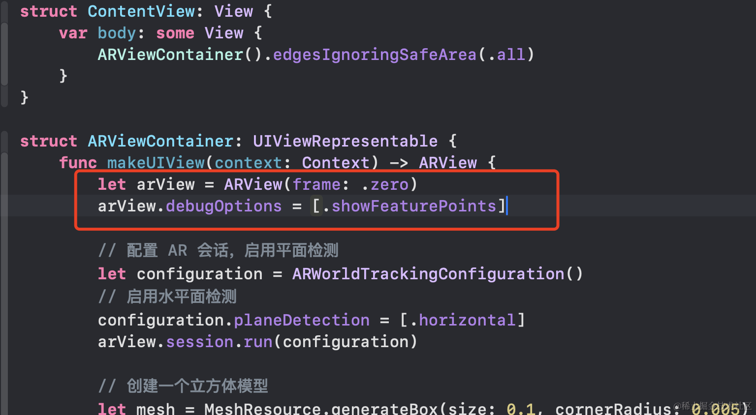 ARKit开启特征点检测等检测方式 1024小神 2024-12-12 76 阅读1分钟 有时候在开发状态,我们可能会遇到检测不到目标的问题,我们可以开启特征点检测,来观察一下是否有检测到特征点,开启之后,就会在屏幕中有特征的地方,显示很多特征点ui,如图所示。 debugOptions = [.showFeaturePoints] environment.background = .color(.gray) 可以开启更多的检测方式: