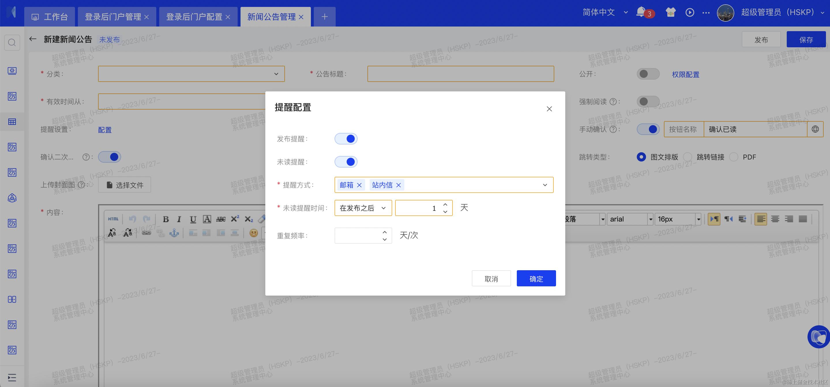 为了确保用户能够及时获取并了解到重要的新闻信息,可以开启强制阅读功能。当用户登录门户后,系统将弹出一个公告弹窗,要求用户阅读完整则公告才能继续使用门户。