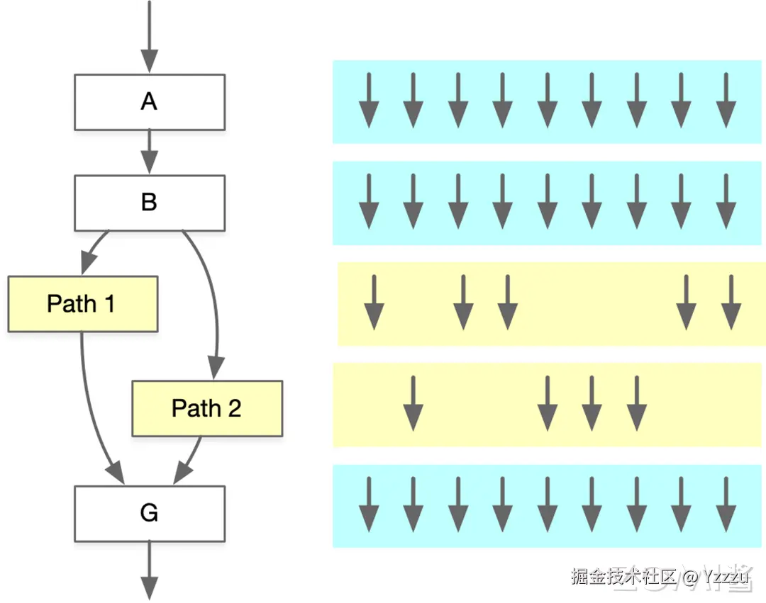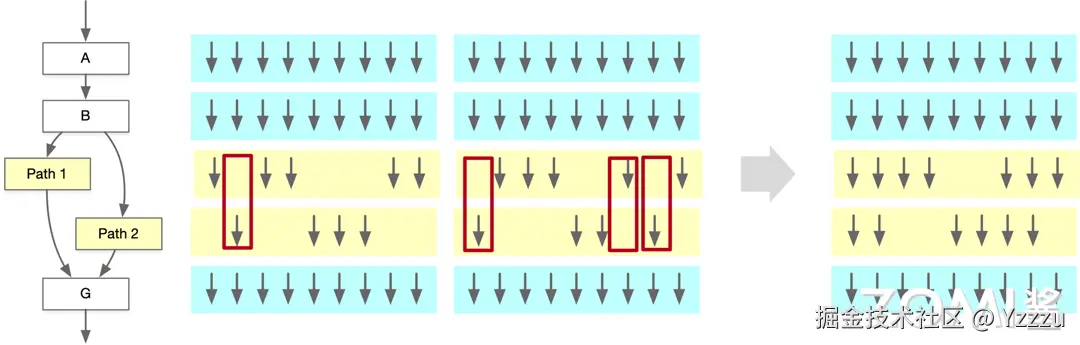 当存在 Path 1 和 Path 2 两条路径的时候,由于某些时钟周期为空,因此在动态合并分支之后执行相同指令的线程,以便同时执行不同的代码路径,从而避免线程之间的等待和资源浪费。