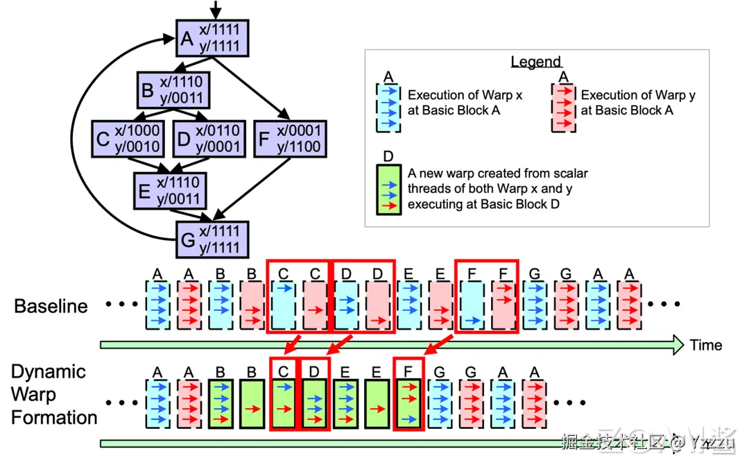 为了解决分支预测的问题,动态 Warp Formating/Merging 在分支后动态合并执行相同指令的线程,从正在等待的 Warps 中形成新的 Warps,分支下每条路径线程用于创建新的 Warp。可以将 Warp X 和 Warp Y 合并为 Warp Z,从而更好地执行相同指令。