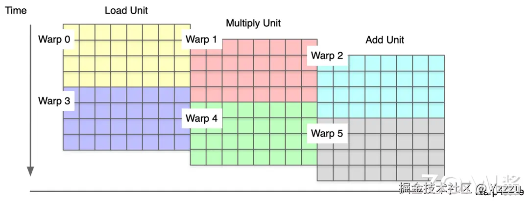 增加了 SIMT 前端硬件,通过线程组 Warp 隐藏线程指令流水。在 CUDA 编程模型中,每一个线程块(thread block)内部需要有很多并行线程,隐式分成了若干个 Warp,每个 Warp 包含串行交错的访存和计算。GPU 通过 Warp Scheduler 动态交错执行,如果一组 Warp0 流水阻塞就会切到下一个 Warp1,隐式通过 Warp 的并行掩盖指令流水阻塞,因此开发者可以得到较好的性能。