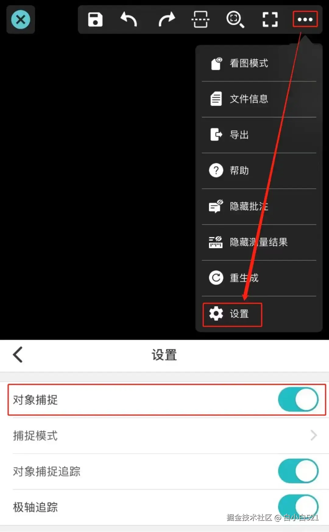 如果你发现测量坐标时,不能精准捕捉坐标点, 只需点击软件右上方“●●●”中的“设置”按钮,将 “对象捕捉” 功能打开即可(因为根据很多用户反映,不小心将此按钮关闭)。